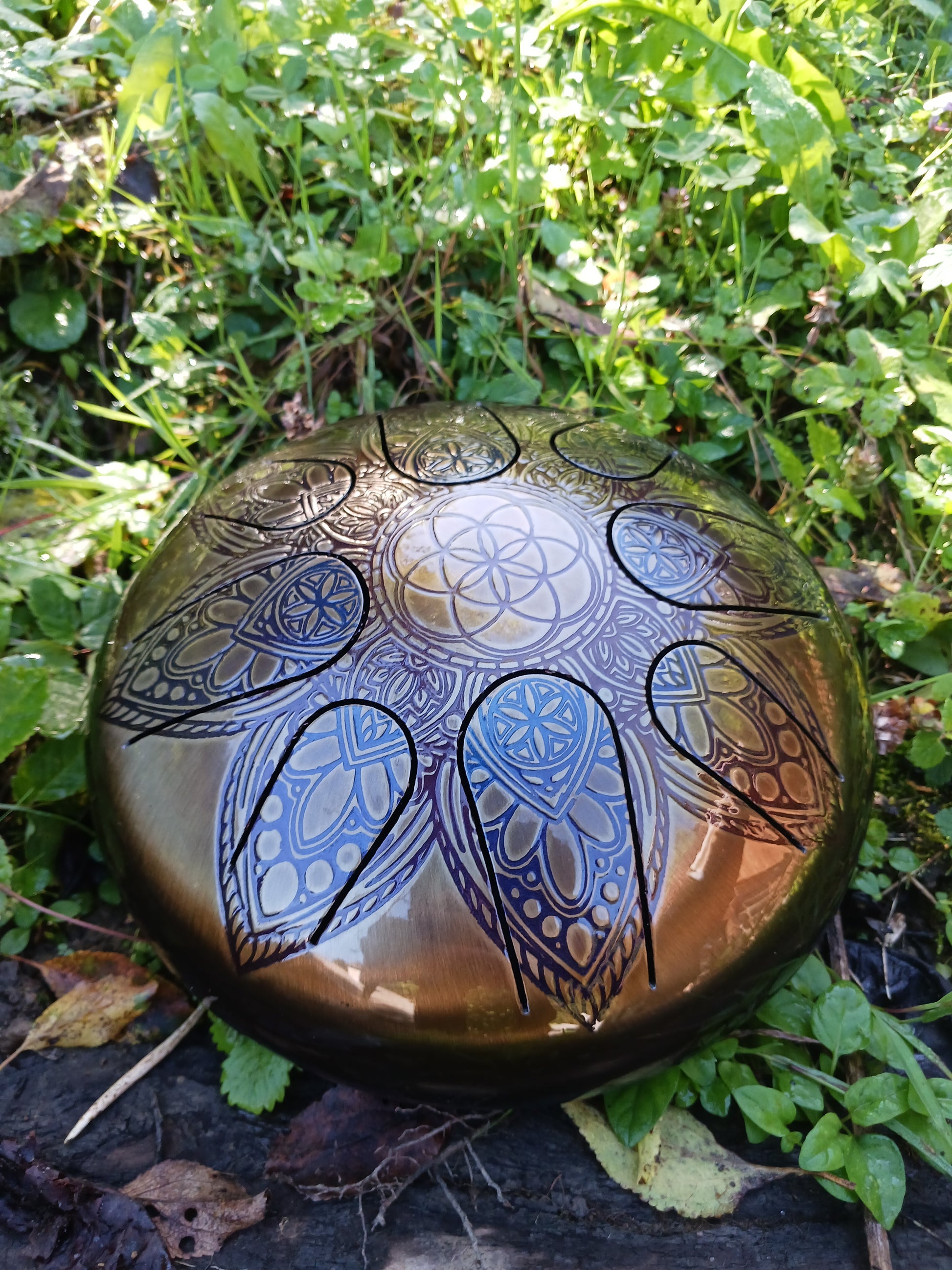 8" tank drum tuned in D akebonk scale. 432hz. Mallets and bag included